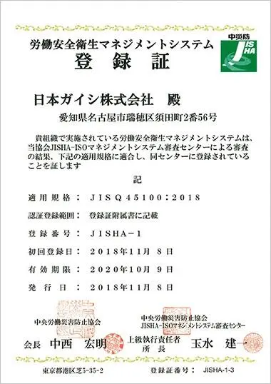 日本ガイシ株式会社(社長:大島卓、本社:名古屋市)はこのほど、2018年9月28日に発行された日本版労働安全衛生マネジメント規格「JIS Q 45100」の中央労働災害防止協会(中災防、JISHA)による認証を日本で初めて取得しました。