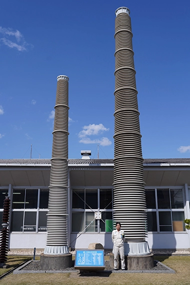 がい管は、変電所などに使われるがいしです。当社はがいし製造のトップメーカーとして、世界に先駆けてUHV(Ultra High Voltage、1,000kV)用の超高圧変電用がいしの製造を手がけ、1980年代には高さ12メートルのUHVがい管(12mがい管)の開発、製造に成功しました。
