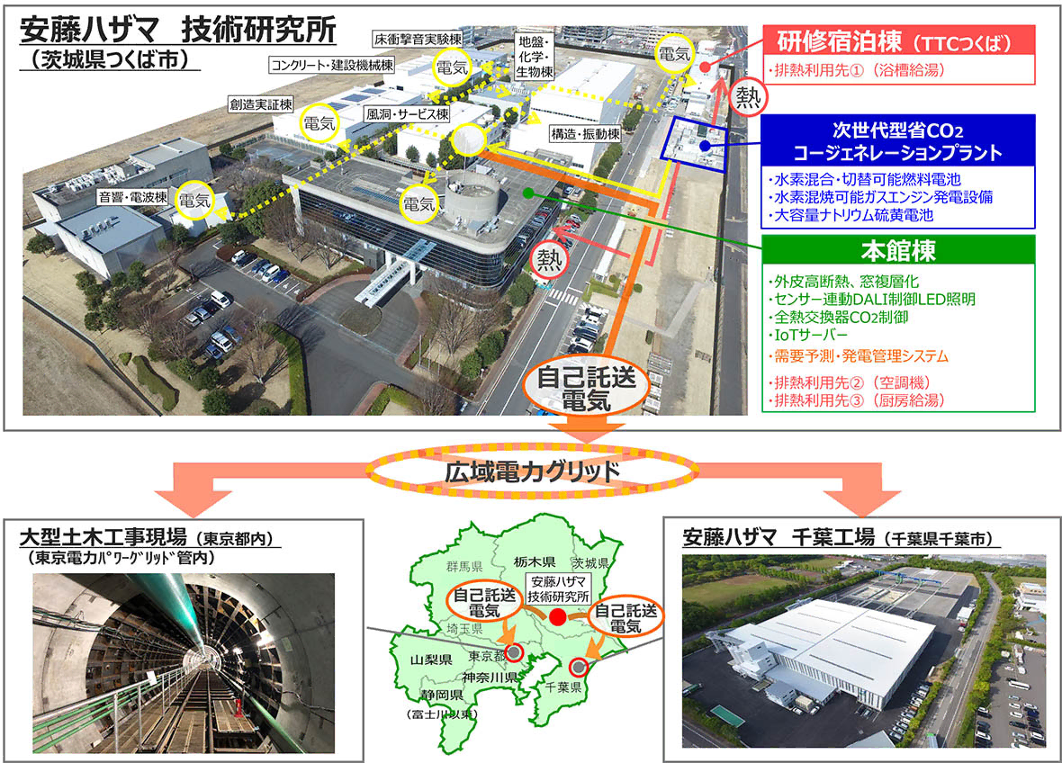 「安藤ハザマ次世代エネルギープロジェクト」は、CO2発生の少ない分散型エネルギーシステムと遠隔地にある複数の需要地の間で電力の自己託送制度を活用したエネルギー融通を行い、広域的な省CO2とエネルギー最適化の検証を行うもので、2018年8月に国土交通省の「平成30年度第1回サステナブル建築物等先導事業(省CO2先導型)」※2に採択されています。