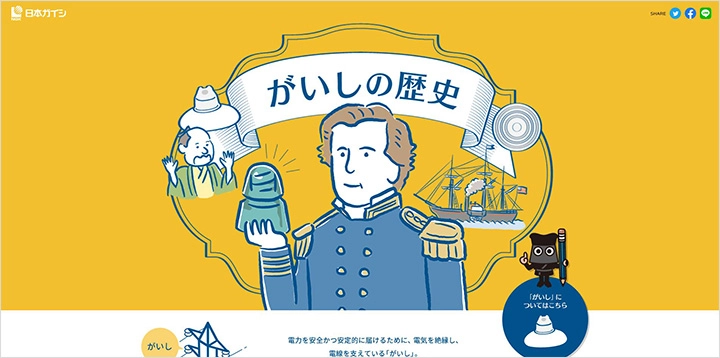 Webサイト「がいしの歴史」は、日本ガイシの祖業である「がいし」の歴史について解説するスペシャルコンテンツです。当社製品に限らずがいし全般を対象に、電気の発見から今日の電力の発展までの歴史に沿って、幅広い方々に伝わるよう、言葉選び、図解など細部までこだわり、分かりやすく解説しています。