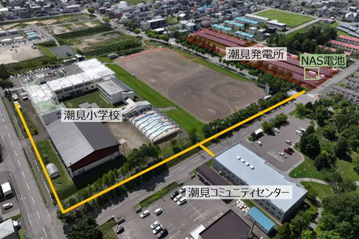 あばしり電力は、網走市潮見地区に太陽光発電設備と電力貯蔵用NAS®電池を設置し、自前の送電線(自営線)で潮見小学校と潮見コミュニティセンターを連系しました。通常時は再生可能エネルギーを両施設へ供給し、停電時には緊急避難場所である両施設を商用系統から切り離し、非常時のバックアップ電源として活用する事業を実施しています。また潮見小学校では、太陽光発電の発電量やCO2削減量をパネルに表示し、児童が直接的に太陽光による発電状況を体験できる場所を提供しています。
