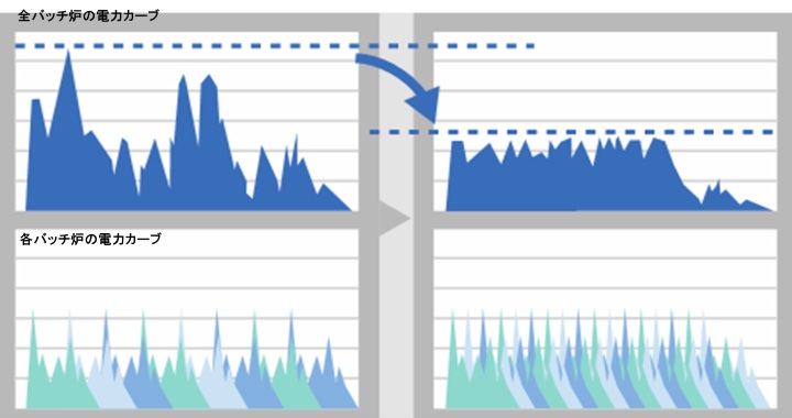 今回導入したAIは、製品ごとの焼成条件や電力カーブ※2、設備の劣化による電力変動などのデータを学習し、ピーク電力を最小化し、生産性を維持したまま、より効率的な生産計画を自動生成します。これにより、複数炉の同時立ち上げによる最大電力使用量を抑制し、それを前提に設計される付帯設備の省エネ化やコンパクト化にもつながります。