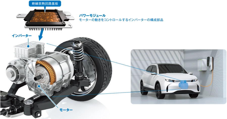 絶縁放熱回路基板はモーター駆動制御や発電機の電力変換制御を行うパワーモジュール用として使われます。パワー半導体への電気入力と、パワー半導体で発生した熱を冷却器へ逃がす役割を担っています。