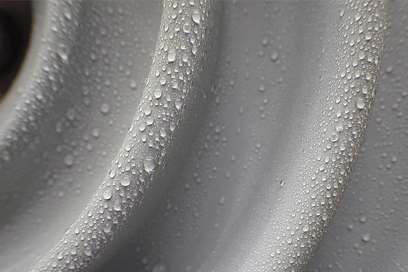 コーティングがいしは、長期信頼性に優れた磁器がいしに、シリコーンゴムを塗布した製品です。シリコーンゴムの優れた撥水性により、がいし表面の漏れ電流を抑制し、放電や騒音の発生を軽減するとともに、耐電圧の向上により、がいし連のコンパクト化に貢献します。