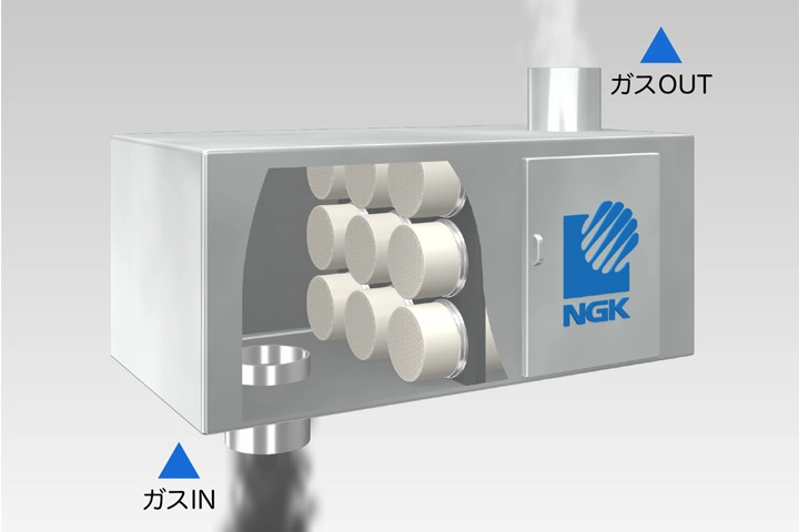 NGKでは、こうした環境課題に対応するため、自動車のディーゼルエンジン向けで高性能セラミックフィルターとして実績のある、ディーゼル・パティキュレート・フィルター(DPF)を搭載した黒煙除去装置を開発。地域との共生を重視するDC事業者や産業施設に向けて、信頼性の高いソリューションを提供しています。