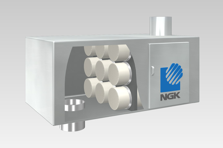 日本ガイシでは、このような黒煙問題の対策として、お客様のディーゼルエンジンの容量や設置環境に応じた最適な黒煙除去装置の設計・提案を行っています。