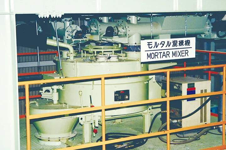 溶融固化体圧縮物などを容器内に十分安定固定するため、高流動・低ブリージングモルタルを用い、充填性を向上させています。