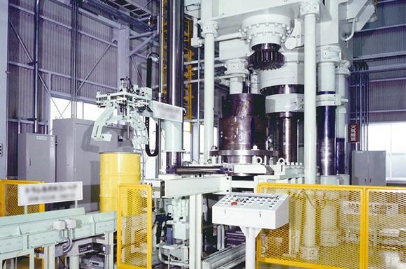 高圧縮プレス装置は不燃性雑固体ドラムを独自の縦絞り高圧縮法により減容し、再び200Lドラムに充填することができます。