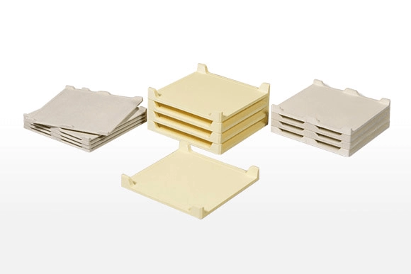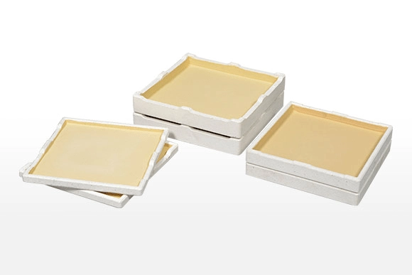 | 特長 | 平滑 緻密 | 耐熱衝撃 応力緩和 | 耐反応性 形状対応 | 肉厚施工 匣鉢対応 |