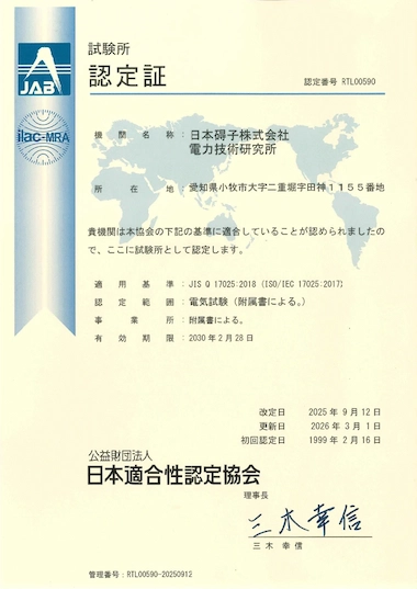 電力技術研究所は、1999年2月にJISQ17025(ISO/IEC17025:試験所および校正機関の能力に関する一般要求事項)に適合する試験所として、(公財)日本適合性認定協会(JAB)に高電圧試験所としては日本ではじめて認定登録されました。