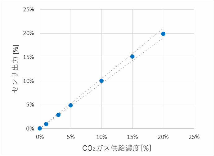 ガス組成:CO2=0~20%, H2O=3%, N2バランス(破線は±5%)