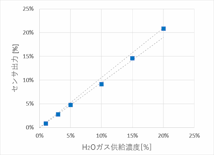 ガス組成:CO2=0%, H2O=0~20%, N2バランス(破線は±5%)