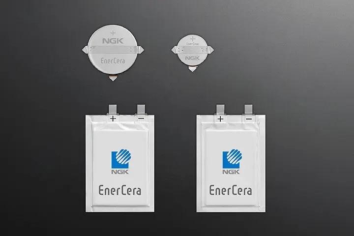 EnerCera(エナセラ)は、超薄型・小型のリチウムイオン二次電池です。NGK独自の結晶配向セラミックス正極板を使用した半固体電池により、従来のリチウムイオン二次電池では併存が難しかった高容量、高出力、高耐熱、長寿命などの特性を兼ね備えています。