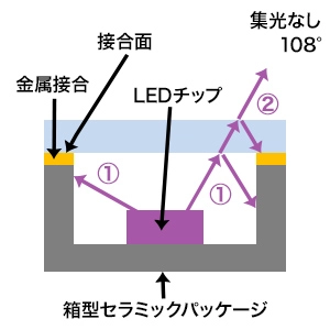 | ①光取り出し効率※ | 93% パッケージでの光吸収はなし | 75% パッケージ側面で光が吸収される |