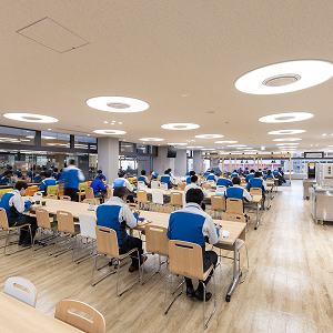 社員食堂は熱田地区と瑞穂地区の2カ所にあり、カフェテリア方式で栄養バランスを重視した多様なメニューを手頃な価格で提供しています。社員が利用できるカフェスペースも備え、ミーティングや休憩に使われています。