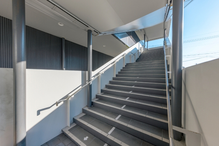 階段には手すりを完備しています。段差の視える化をするため、表示テープを貼っています。
