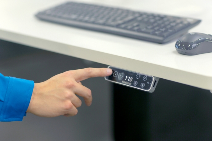 ボタンで高さを上下できる可動式電動昇降デスクを導入しています。