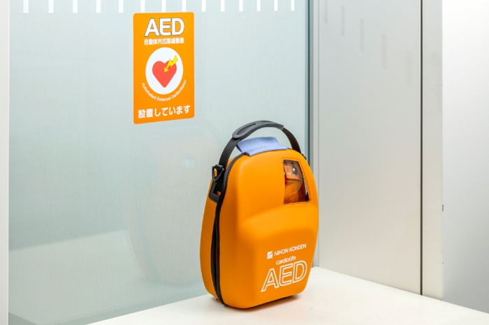 社内にはAED(自動体外式除細動器)を随所に配置し、緊急時に備えています。定期的に使用方法の研修も行っています。