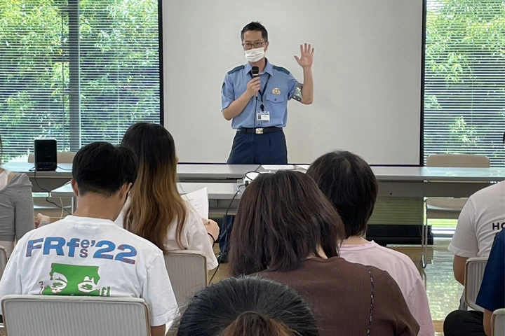 日本ガイシインターナショナルハウスで防災訓練と交通安全・防犯セミナーを開催しました。防災訓練では地震発生に伴いキッチンから出火した想定で、消防署への通報訓練や屋外への避難訓練を行い、緊急時の手順と避難経路を確認しました。交通安全・防犯セミナーでは天白警察署員により犯罪から自分自身を守るための対策や交通ルールなどが紹介されました。