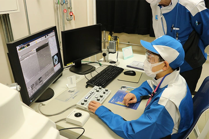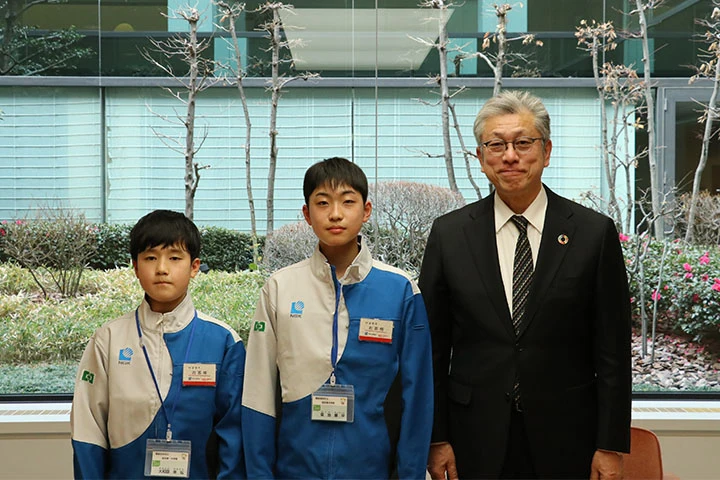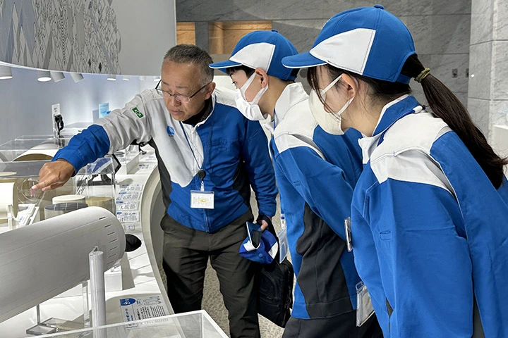この職場体験は、東日本大震災で甚大な被害を受けた陸前高田市への支援として、名古屋市が行っている「丸ごと支援」に基づいたもので、当社は2016年から受け入れを実施し今回で7回目となります。生徒たちは、研究開発本部の吉野隆史執行役員から基盤研究所の概要を聞いた後、電子顕微鏡での分析や、クリーンルームでの作業を体験。その後、総務部所管の山田忠明取締役専務執行役員を訪問し、職場体験の感想や今後の抱負などを伝えました。
