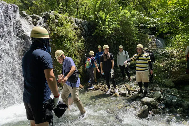この日はインストラクターの指導の下、やどりき水源林に生息する生物の観察のほか、植物や生き物などの説明を受けながら渓流散策を行いました。このほか、近隣の施設でバーベキューやマスのつかみ取りなどを行い、森林保全・再生の大切さを学びました。