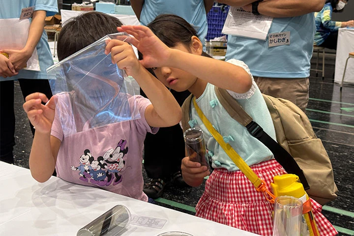 演示講師たちは「偏光板」を使った手品を子どもたちに披露した後、手品で使った「壁が出現する筒」の作り方をレクチャー。ばらばらな向きに振動する光の波を1つの方向にそろえる偏光板の特性を説明し、光の変化を体験してもらいました。