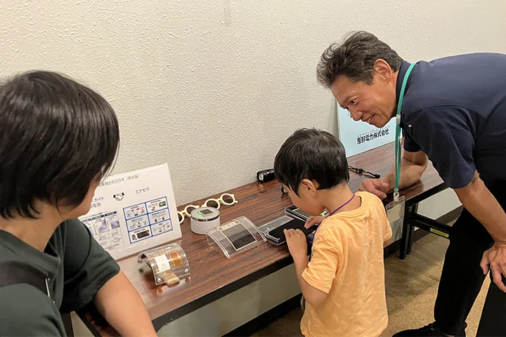 ブースでは、「恵那市内におけるエネルギー地産地消を学ぼう」と題し、NAS電池を活用した恵那電力の取り組みや恵那市内の再生可能エネルギーについて、クイズを交えながら分かりやすく紹介。併せて「NGKサイエンスサイト」の実験・工作メニューから、磁石とスポンジを使って“ローレンツ力”について学べる科学実験を子どもたちに体験してもらい、科学の楽しさをPRしました。また、日本ガイシが出資するエネコートテクノロジーズ社とNV推進本部の協力の下、ペロブスカイト太陽電池とリチウムイオン二次電池「EnerCera」を組み合わせた展示品も初出展し、多くの来場者から注目を集めました。